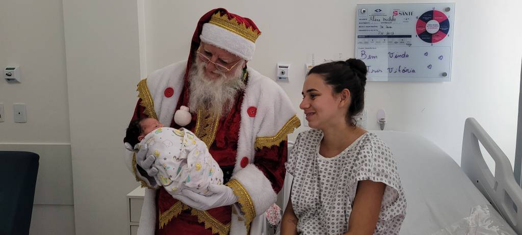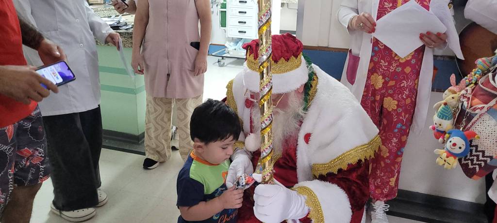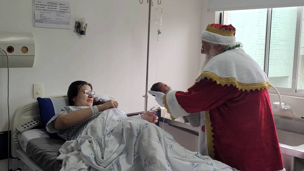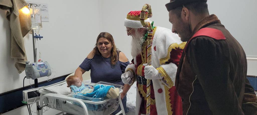Após uma longa e marcante visita ao HRS, o grupo seguiu até o Hospital Intermunicipal Dr. Aryzone Mendes de Araújo (HGI). No local, a alegria transbordou entre pacientes e equipes, especialmente durante a visita à UTI Neonatal, onde o Papai Noel conheceu os pequeninos recém-nascidos que chegaram para trazer luz, esperança e renovação às famílias, ainda mais neste período tão simbólico do Natal.