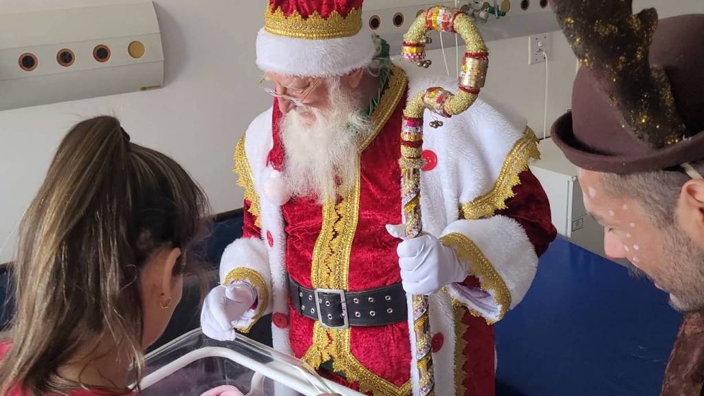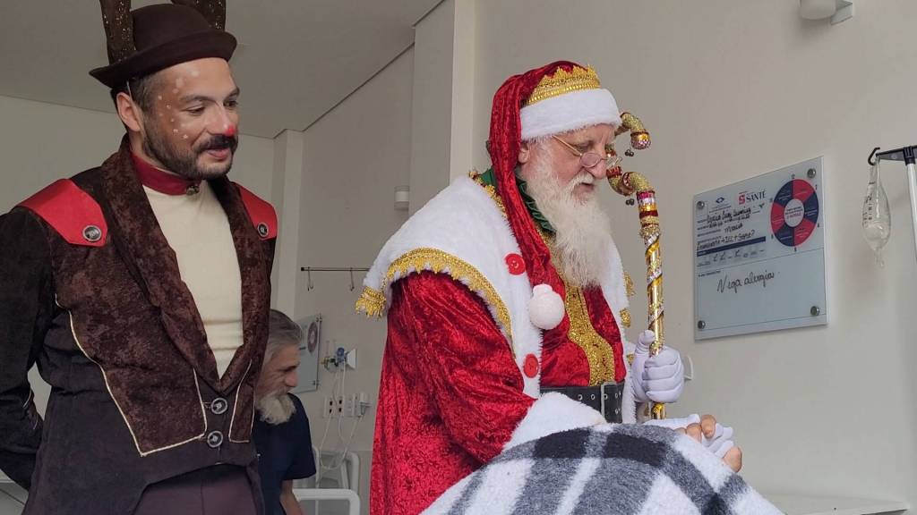 A visita teve início no Hospital Regional do Sudoeste (HRS), onde o Papai Noel percorreu as alas de internamento, despertando sorrisos, emoção e levando mensagens de Feliz Natal. Funcionários e pacientes se emocionaram com a presença do Bom Velhinho, que também realizou a entrega de pequenas lembranças e bombons, simbolizando o espírito natalino.