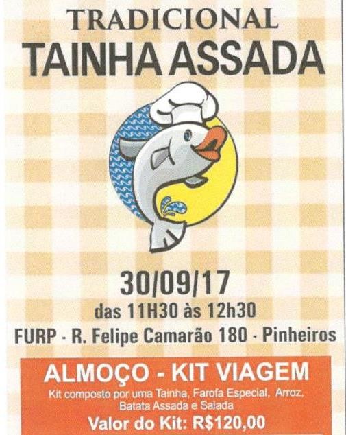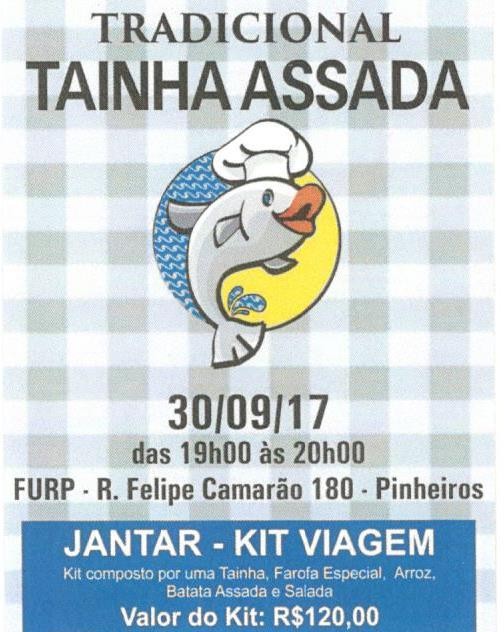 No jantar, o cardápio das mesas será composto de três tainhas assadas, farofa especial, arroz, batata assada e saladas.