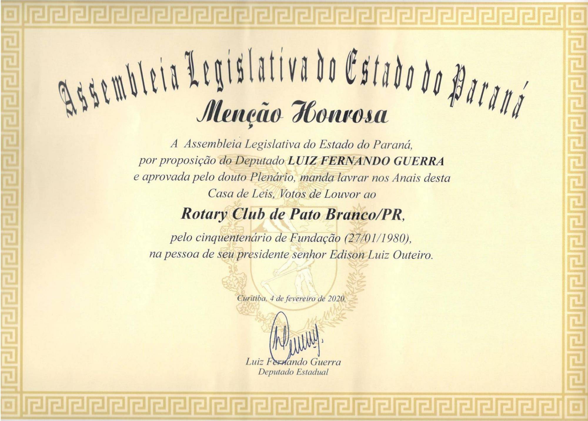 A Assembleia Legislativa do Estado do Paraná, encaminhou ao Rotary Club de Pato Branco, Certificado de Menção Honrosa, pelo transcurso do cinquentenário do Clube.