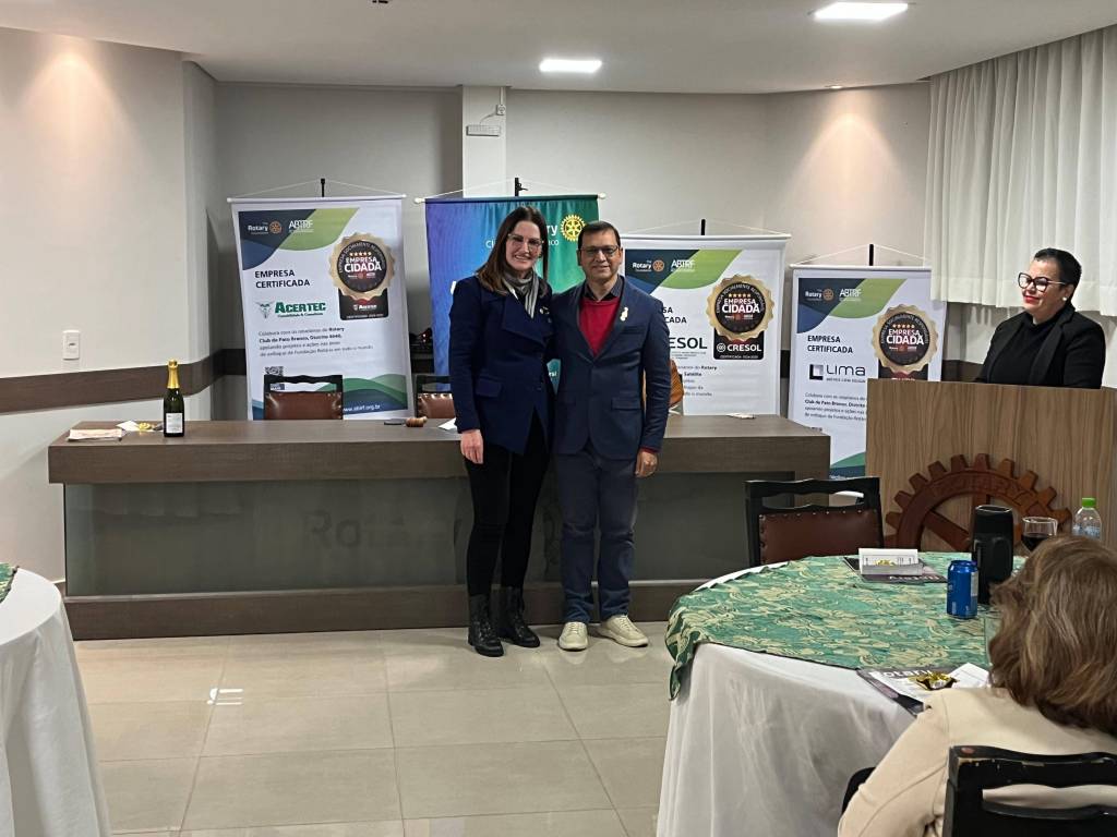 Na noite de celebração e transição de lideranças, o Rotary Club de Pato Branco viveu um momento marcante: a transmissão de posse da presidência do companheiro Elio Santos Mello, que conduziu o clube com dedicação para a companheira Tânia Raber Berteli, que assume o novo ciclo sob a mensagem presidencial do Rotary internacional “Unidos para fazer o bem”.